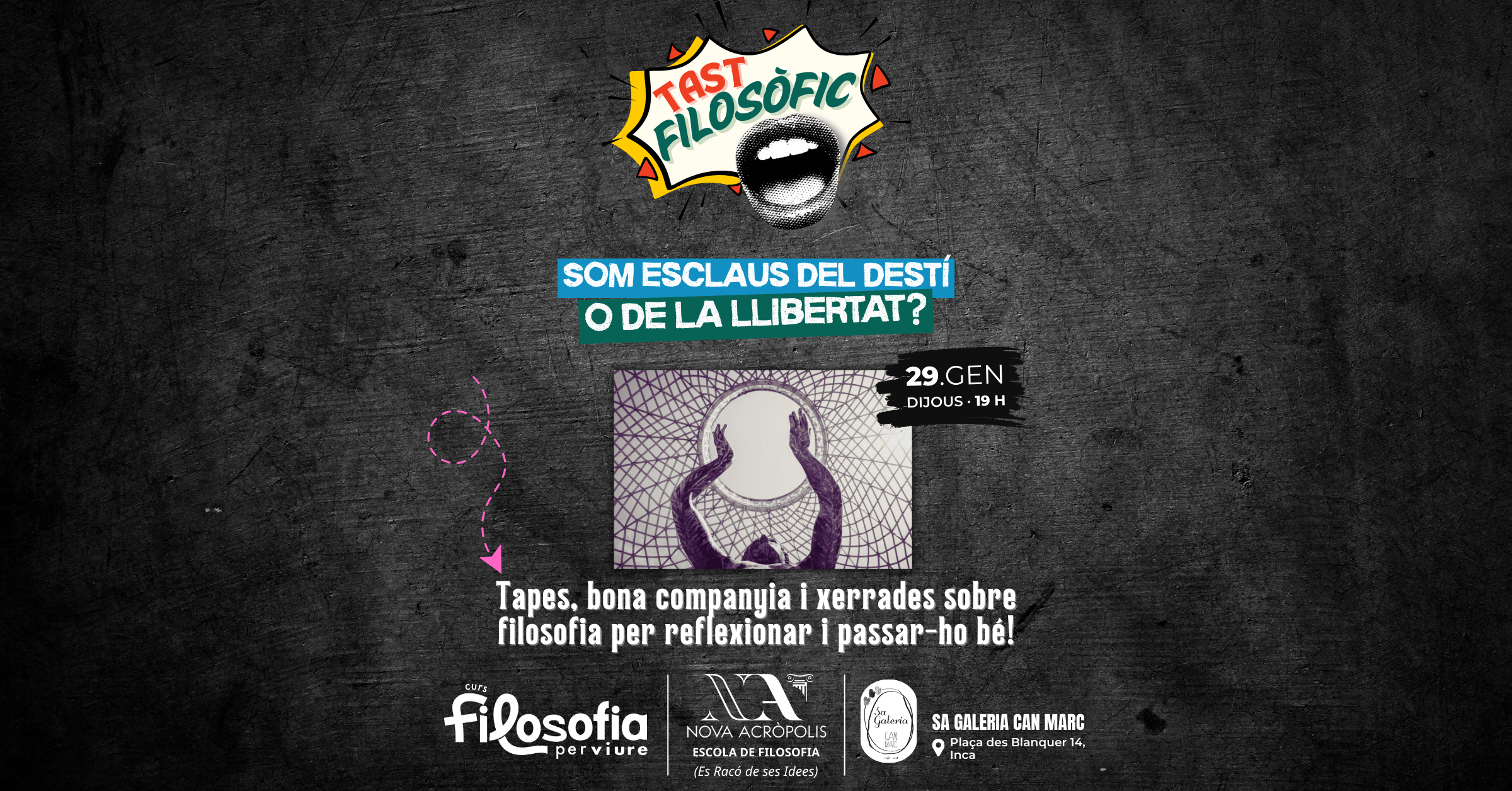 Tapes, bona companyia i xerrades sobre filosofia per reflexionar i passar-ho bé!🎭 En aquest Tast Filosòfic viurem una experiència diferent, amb petites escenes teatrals!💬 A través de dinàmiques participatives i preguntes obertes reflexionarem sobre el destí i la llibertat.⚡ Aquest Tast Filosòfic és per a tothom. No cal cap coneixement previ de filosofia: només ganes […]